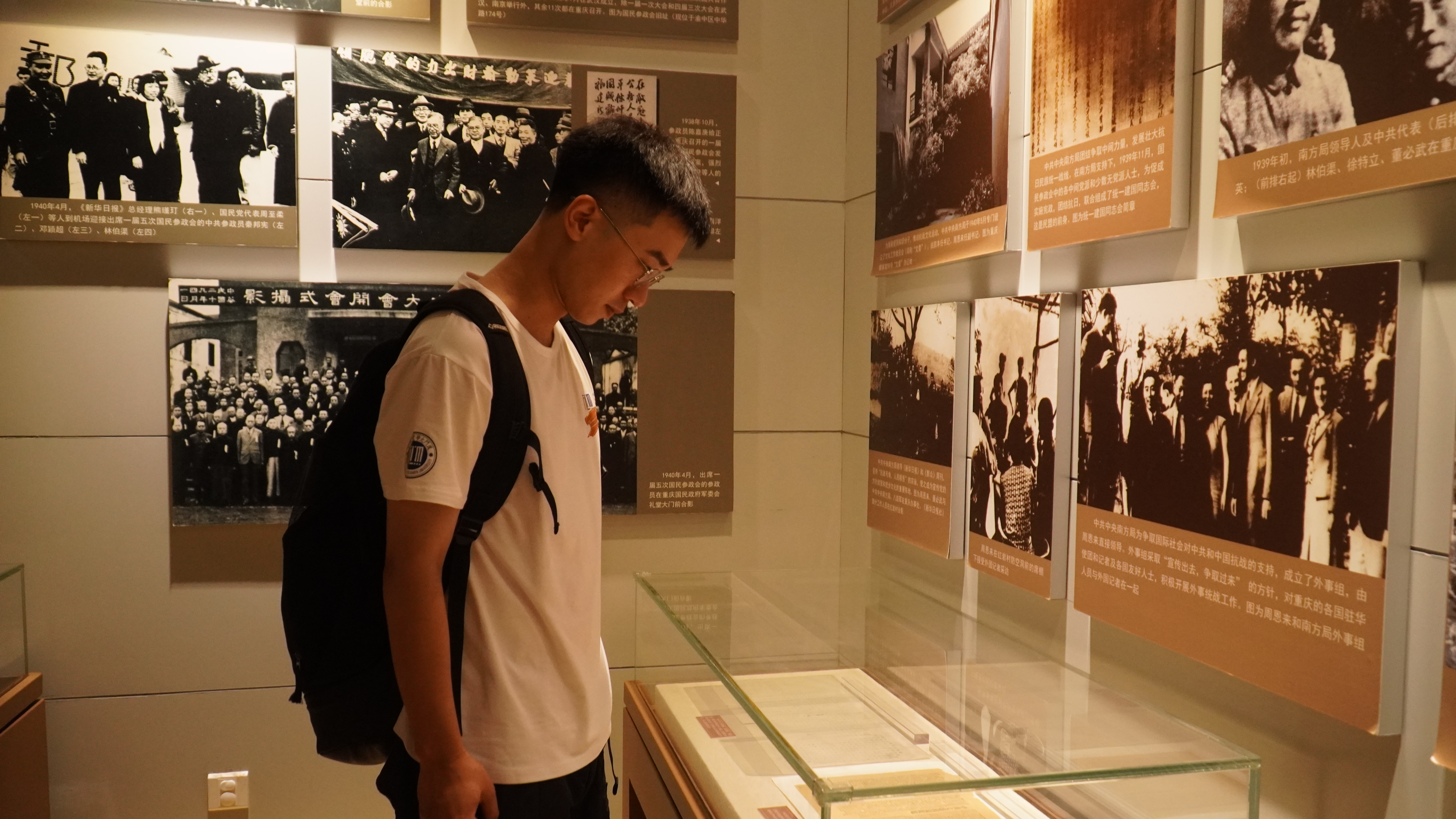 在嘉庚精神的感召下,调研团于22日奔赴位于重庆的红岩博物馆。在中共中央南方局的历史陈列展厅中,看到了华人华侨在全民族抗战时期贡献的巨大力量。周恩来、叶剑英、董必武等多次会见归国考察参政的陈嘉庚、司徒美堂等华侨领袖,共同沟通,真诚合作,在救国抗日的旗帜下,共赴国难,为完成民族解放的伟大使命而共同努力。1940年3月,陈嘉庚先生发起组织南洋华侨回国慰劳视察团,回国慰劳抗日军民和考察抗战实况。同年5月,他一行到达延安,多次受到毛泽东、朱德、周恩来等的接见。被誉为“古今中外最伟大的提案”的陈嘉庚电报提案(在福建新闻社上提出):在敌寇未退出国土以前,公务人员任何人谈和平条件者当以汉奸国贼论。